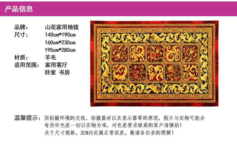 山花 欧式经典花纹进口新西兰羊毛客厅卧室书房环保阻燃防滑地毯