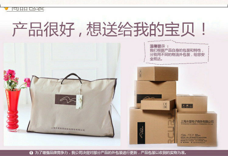 1、关于枕套花型:由于面料裁剪的原因,可能会造成枕套的花纹跟实物图有所区别 2、因拍摄时的光线及显示器的不同,会造成一定的色差 3、关于包装:为增强竞争力,公司会不定期更新部分产品外包装,产品包装以收到实物为准。产品图片实物拍摄,以上问题均不属于质量问题, 不能接受的买家慎重考虑。如有疑义可咨询客服,谢谢! |