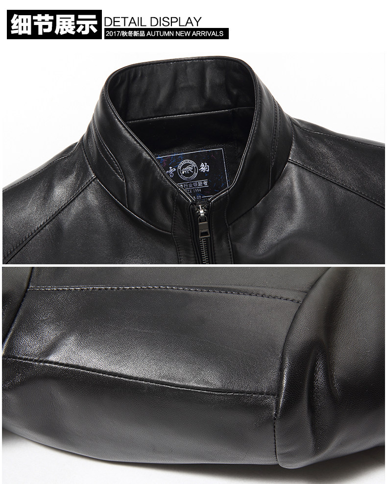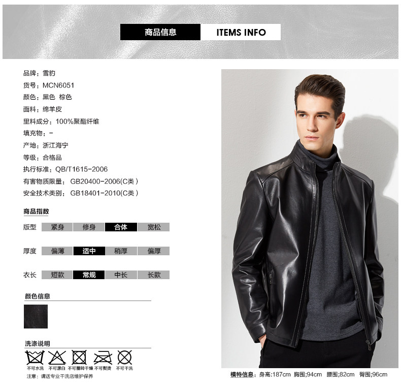 以下是雪豹男士皮夹克新款绵羊皮海宁真皮皮衣 男式薄皮衣春秋外套6051的详细说明,厂家介绍,求购联系信息,最终解释权归浙江雪豹服饰有限公司所有