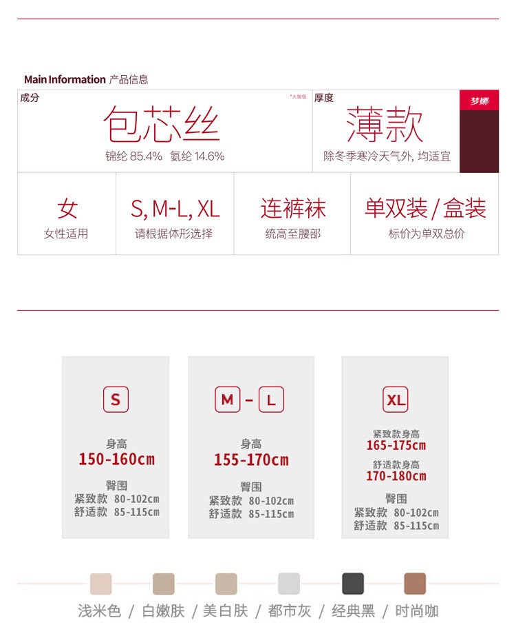 以下是梦娜6双长丝袜连裤袜防勾丝超薄款女隐形透明肉色性感夏季浅肤黑的详细说明,厂家介绍,求购联系信息,最终解释权归浙江梦娜袜业股份有限公司所有