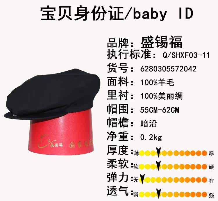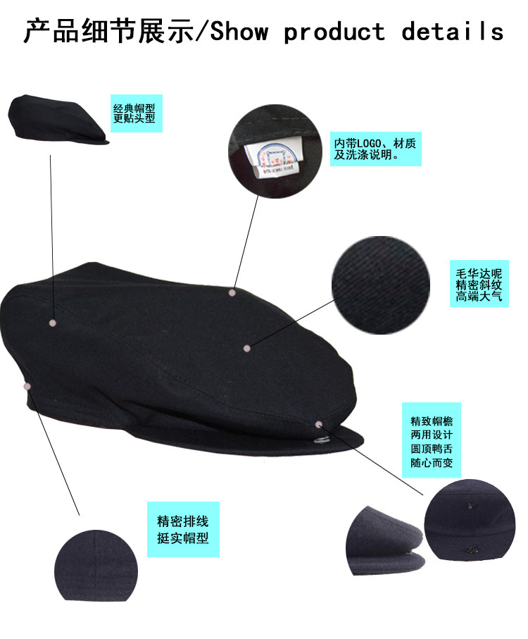 产品介绍:精梳纱织制,呢面平整光洁手感挺括,面料厚实坚固耐用,盛锡福经典传统产品。款式稳重大方,特别适合中老年人。