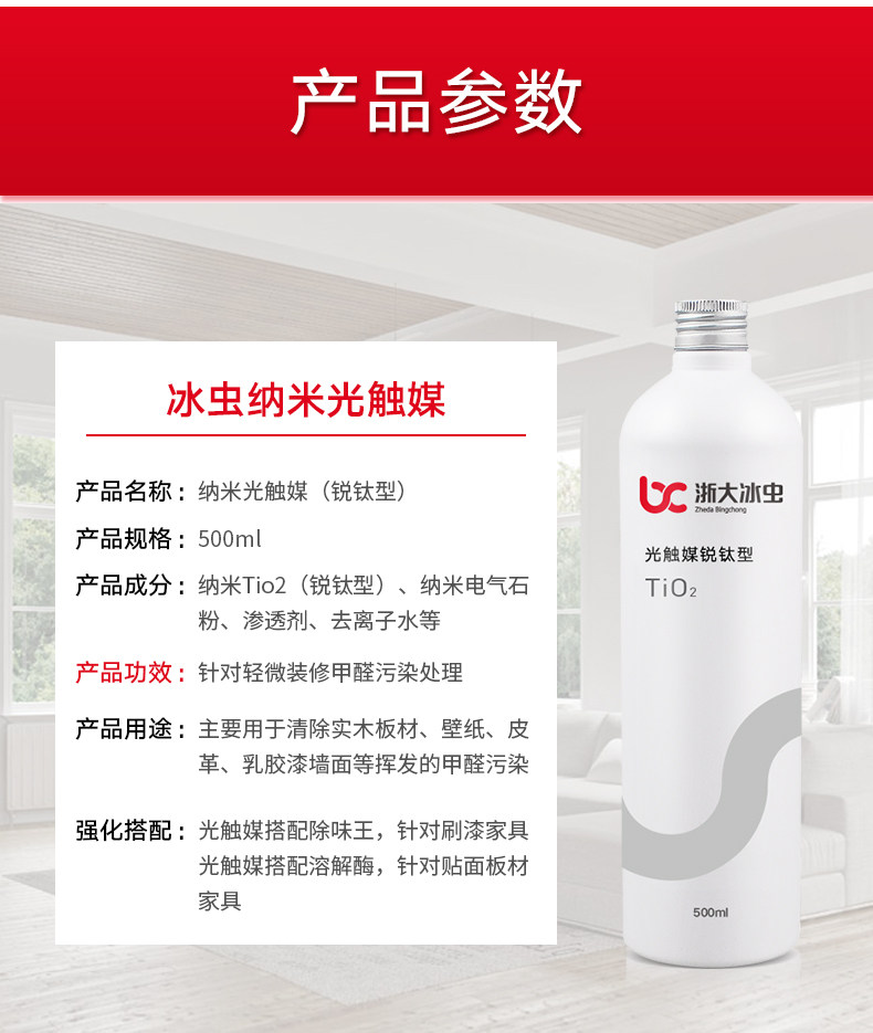 以下是浙大冰虫光触媒去除甲醛清除剂家用新房装修家具除味强力型喷雾剂的详细说明,厂家介绍,求购联系信息,最终解释权归浙江冰虫环保科技有限公司所有