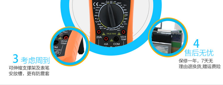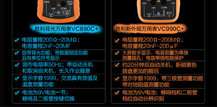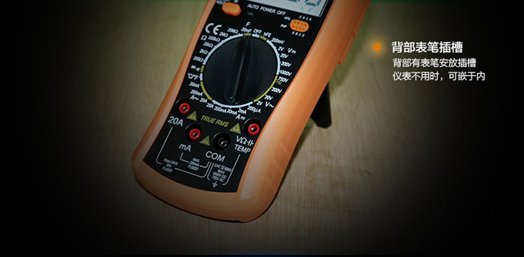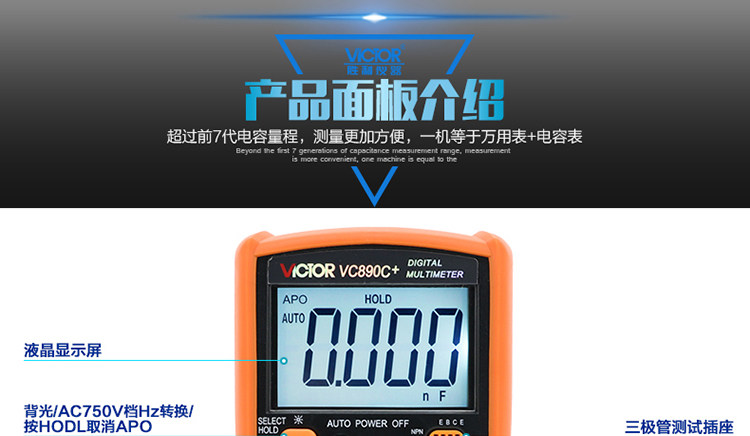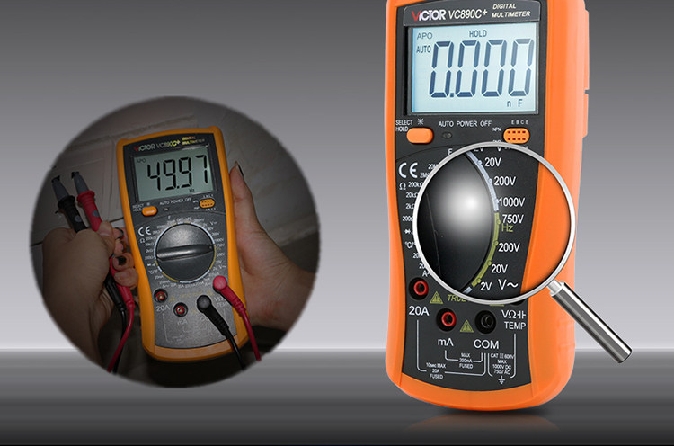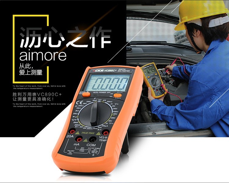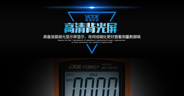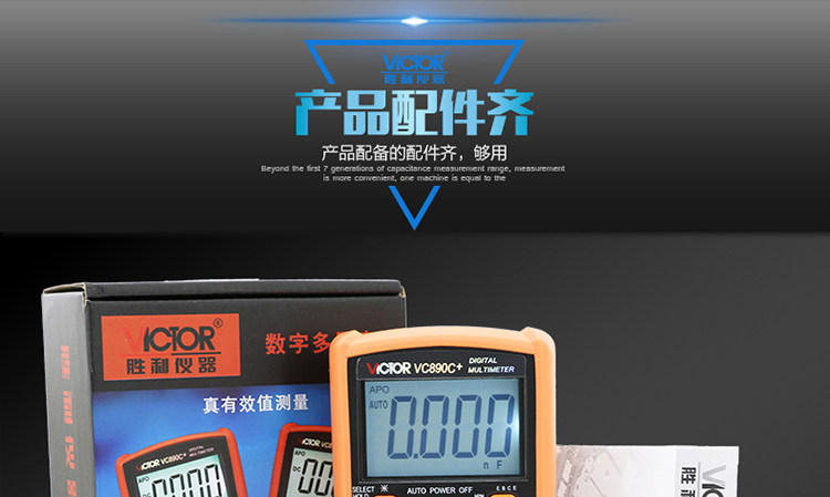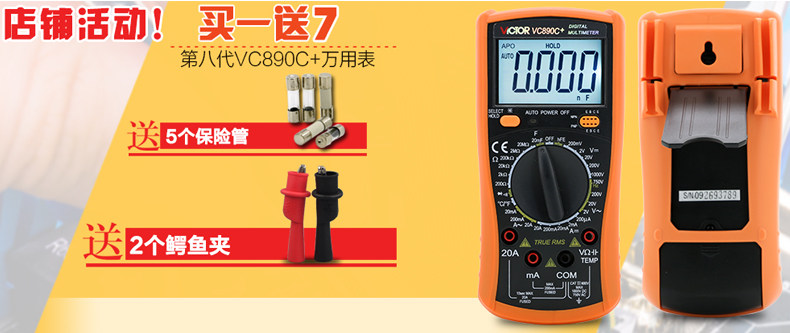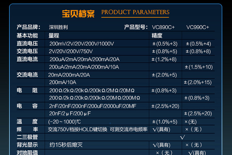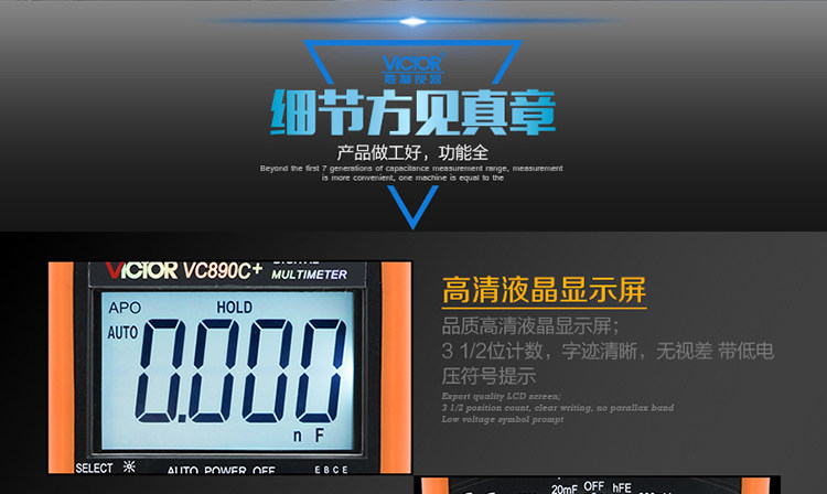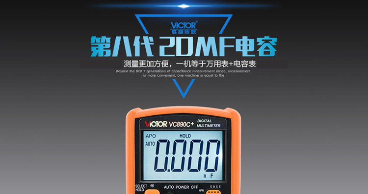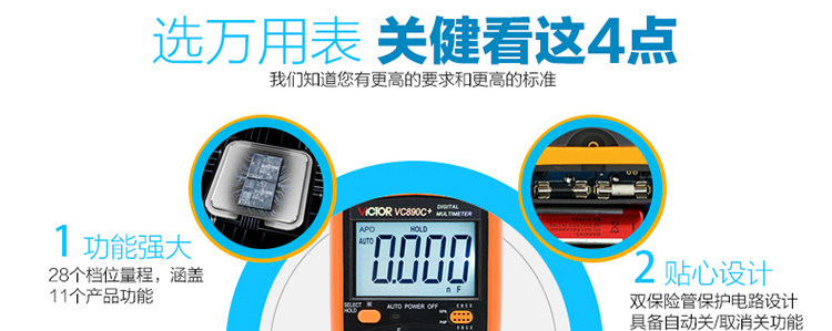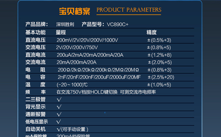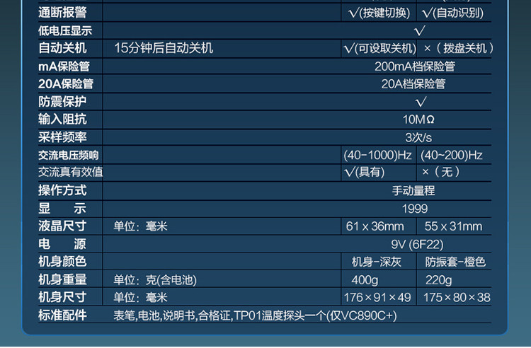 | 特点: | | 1、新型防振套,流线型设计,手感舒适; | | 2、大屏幕显示,字迹清楚; | | 3、金属屏蔽板,防磁,抗干扰能力强; | | 4、使用单片机控制背光开与关,及自动关机的开与关,满足不同场合的工作需要; | | 5、全保护功能,防高压打火电路设计; | | | | 基本功能 | 量程. | 基本准确度 | | 直流电压 | 200mV/2V/20V/200V | ±(0.5%+3) | | 1000V | ±(0.8%+10) | | 交流电压 | 2V/20V/200V | ±(0.8%+5) | | 750V | ±(1.2%+10) | | 直流电流 | 200uA/2mA/20mA | ±(0.8%+10) | | 200mA | ±(1.2%+8) | | 20A | ±(2.0%+5) | | 交流电流 | 20mA | ±(1.0%+15) | | 200mA | ±(2.0%+5) | | 20A | ±(3.0%+10) | | 电 阻 | 200Ω | ±(0.8%+5) | | 2kΩ/20kΩ/200kΩ/2MΩ | ±(0.8%+3) | | 20MΩ | ±(1.0%+25) | | 电 容 | 2nF | ±(5.0%+40) | | 20nF/200nF/200uF | ±(2.5%+20) | | 2000uF/10MF/20MF | ±(5.0%+10) | | 温 度 | (-20~1000)℃ | <400℃±(1.0%+5) ≥400℃±(1.5%+15) | | 特殊功能 | VC890C+ | | 二、三极管测试 | √ | | 背光显示 | √ | | 通断报警 | √ | | 市电频率 | √(在交流750V档按HOLD键切换) | | 低电压显示 | √ | | 自动关机 | √(可手动设置) | | 功能保护 | √ | | 200mA档保险管 | √ | | 20A档保险管 | √ | | 防震保护 | √ | | 输入阻抗 | 10MΩ | | 采样频率 | 3次/s | | 交流电压频响 | (40-1000)Hz真有效值测量 | | 操作方式 | 手动量程 | | 显示 | 1999 | | 液晶尺寸 | 61 x 36mm | | 电源 | 9V (6F22) | | | | | | | | | |一|般|特|征| | | 机身颜色 | 机身-黑色 防振套-橘黄 | | 机身重量 | 约400g (含电池) | | 机身尺寸 | 176×91×49mm | | 标准配件 | 表笔,电池,说明书,合格证,TP01温度探头一个(仅VC890C+) | | 标准内包装 | 彩盒 | | 外包装尺寸 | 405X350X450mm | | 标准包装数量 | 30台 | | 标准包装箱毛重 | 约25kg