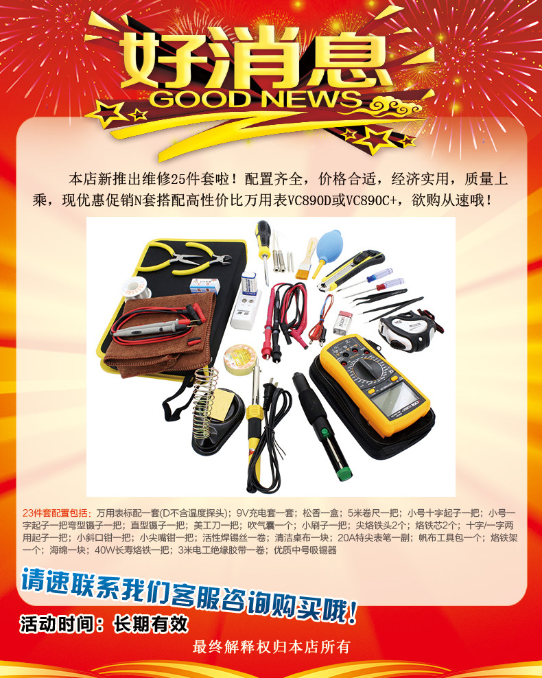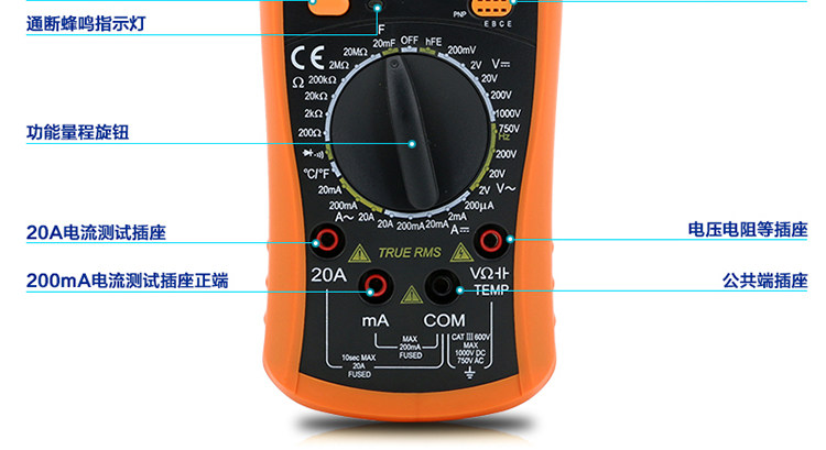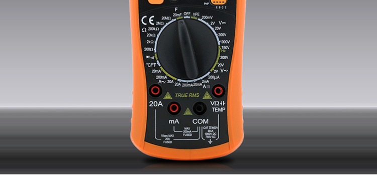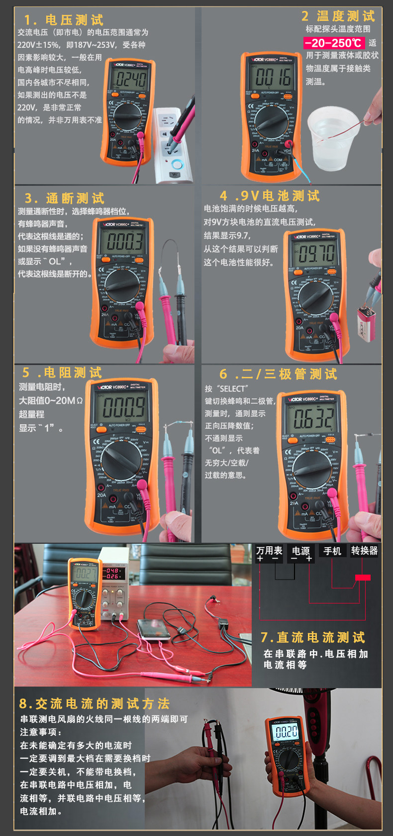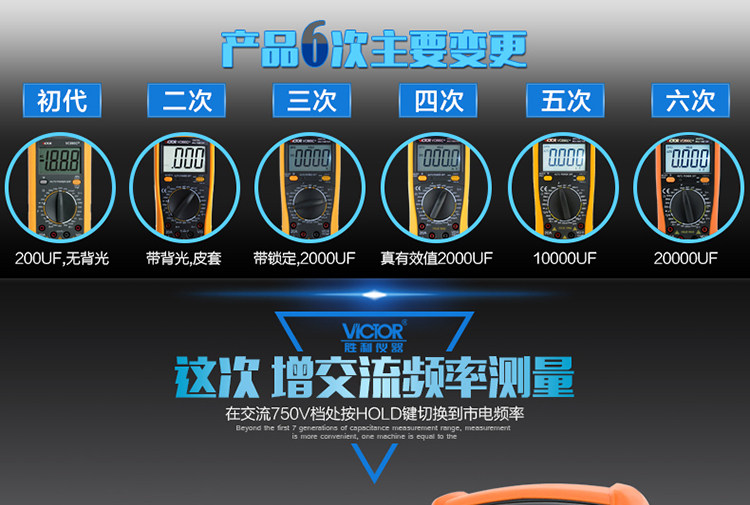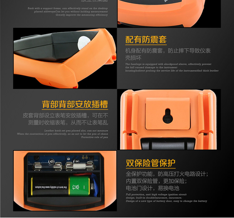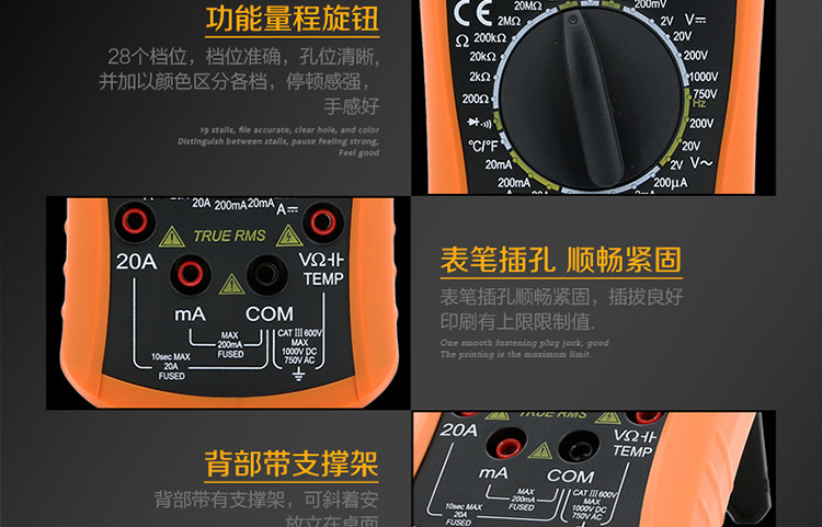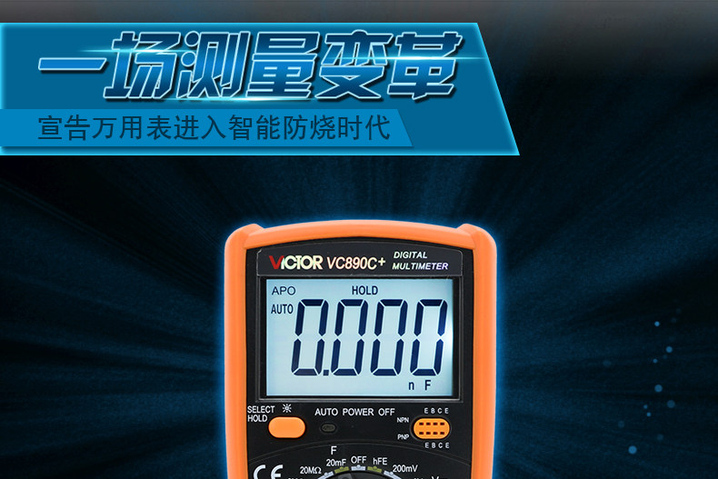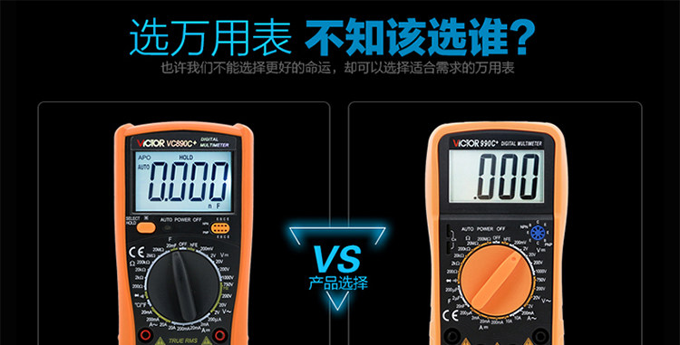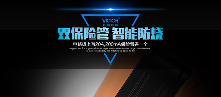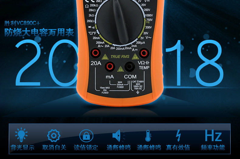 | 特点: | | 1、新型防振套,流线型设计,手感舒适; | | 2、大屏幕显示,字迹清楚; | | 3、金属屏蔽板,防磁,抗干扰能力强; | | 4、使用单片机控制背光开与关,及自动关机的开与关,满足不同场合的工作需要; | | 5、全保护功能,防高压打火电路设计; | | | | 基本功能 | 量程. | 基本准确度 | | 直流电压 | 200mV/2V/20V/200V | ±(0.5%+3) | | 1000V | ±(0.8%+10) | | 交流电压 | 2V/20V/200V | ±(0.8%+5) | | 750V | ±(1.2%+10) | | 直流电流 | 200uA/2mA/20mA | ±(0.8%+10) | | 200mA | ±(1.2%+8) | | 20A | ±(2.0%+5) | | 交流电流 | 20mA | ±(1.0%+15) | | 200mA | ±(2.0%+5) | | 20A | ±(3.0%+10) | | 电 阻 | 200Ω | ±(0.8%+5) | | 2kΩ/20kΩ/200kΩ/2MΩ | ±(0.8%+3) | | 20MΩ | ±(1.0%+25) | | 电 容 | 2nF | ±(5.0%+40) | | 20nF/200nF/200uF | ±(2.5%+20) | | 2000uF/10MF/20MF | ±(5.0%+10) | | 温 度 | (-20~1000)℃ | <400℃±(1.0%+5) ≥400℃±(1.5%+15) | | 特殊功能 | VC890C+ | | 二、三极管测试 | √ | | 背光显示 | √ | | 通断报警 | √ | | 市电频率 | √(在交流750V档按HOLD键切换) | | 低电压显示 | √ | | 自动关机 | √(可手动设置) | | 功能保护 | √ | | 200mA档保险管 | √ | | 20A档保险管 | √ | | 防震保护 | √ | | 输入阻抗 | 10MΩ | | 采样频率 | 3次/s | | 交流电压频响 | (40-1000)Hz真有效值测量 | | 操作方式 | 手动量程 | | 显示 | 1999 | | 液晶尺寸 | 61 x 36mm | | 电源 | 9V (6F22) | | | | | | | | | |一|般|特|征| | | 机身颜色 | 机身-黑色 防振套-橘黄 | | 机身重量 | 约400g (含电池) | | 机身尺寸 | 176×91×49mm | | 标准配件 | 表笔,电池,说明书,合格证,TP01温度探头一个(仅VC890C+) | | 标准内包装 | 彩盒 | | 外包装尺寸 | 405X350X450mm | | 标准包装数量 | 30台 | | 标准包装箱毛重 | 约25kg
