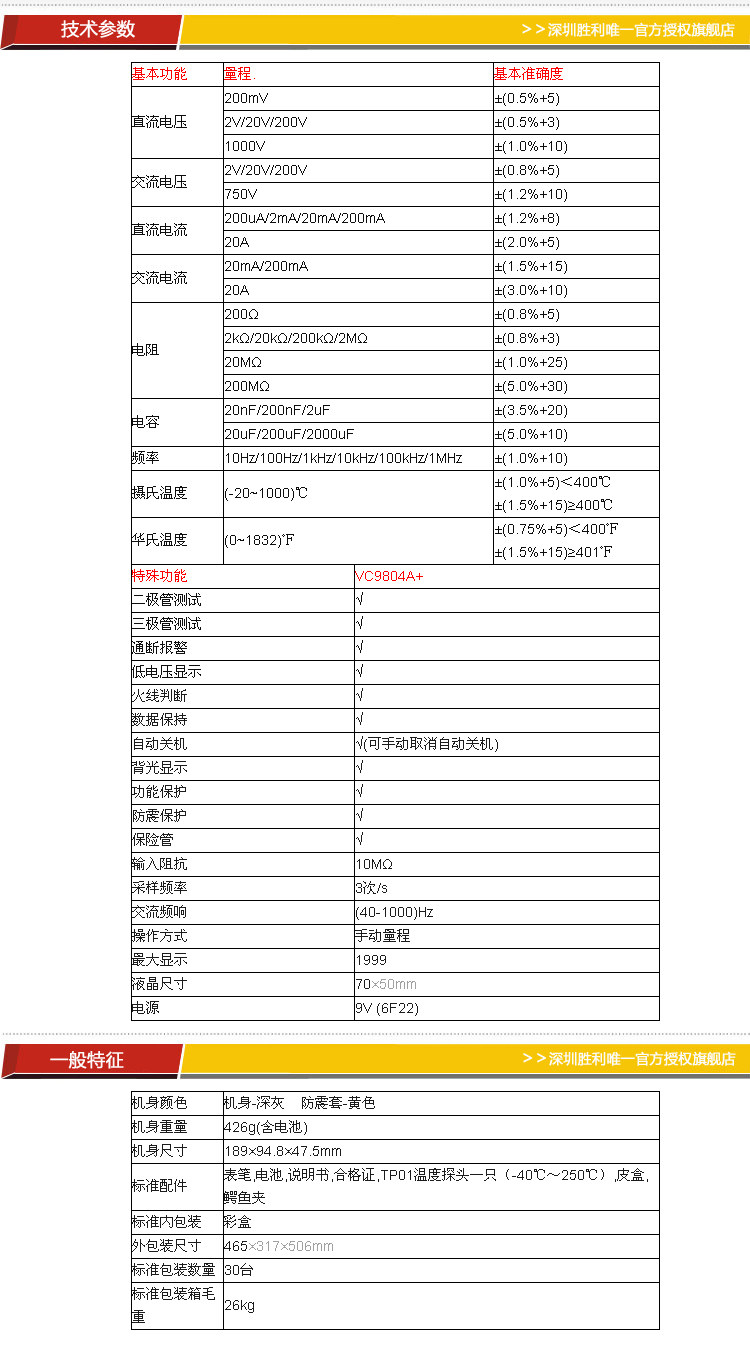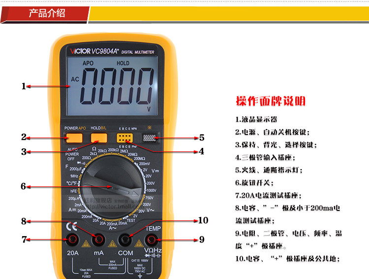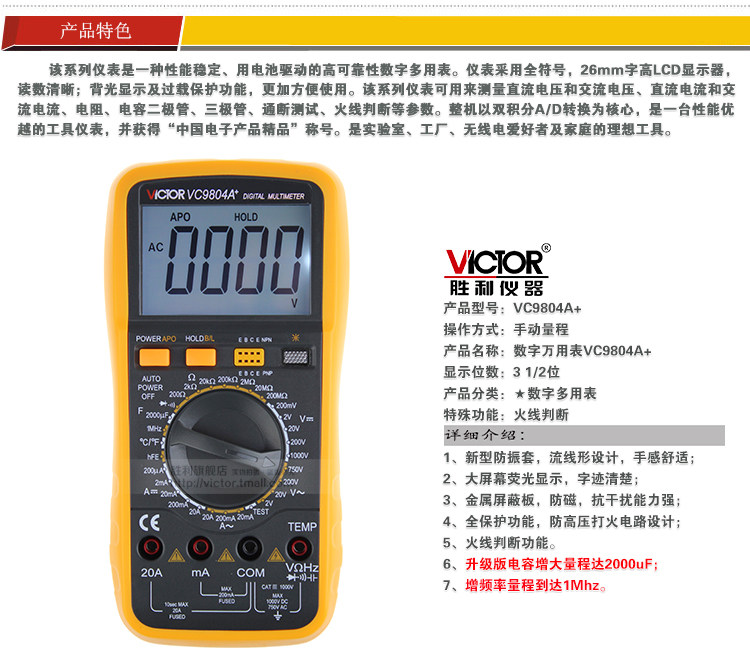 胜利仪器VC9804A+ 高精度数字万用表 带测温 频率 火线判断功能