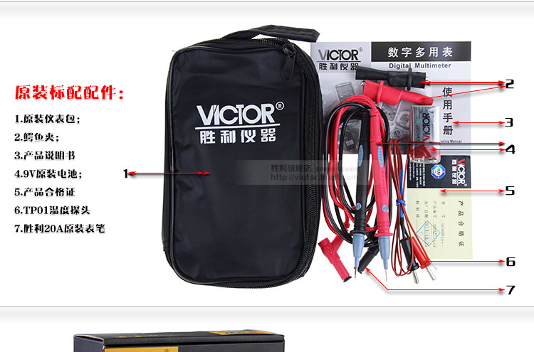 表笔,电池,说明书,合格证,TP01温度探头一只(-40℃~250℃),皮盒,鳄鱼夹