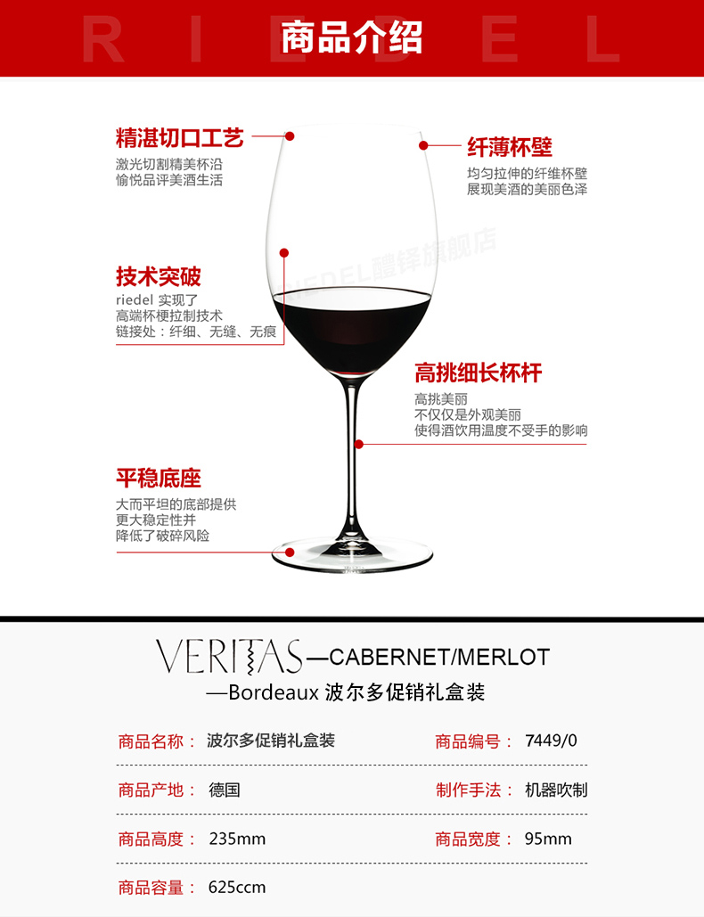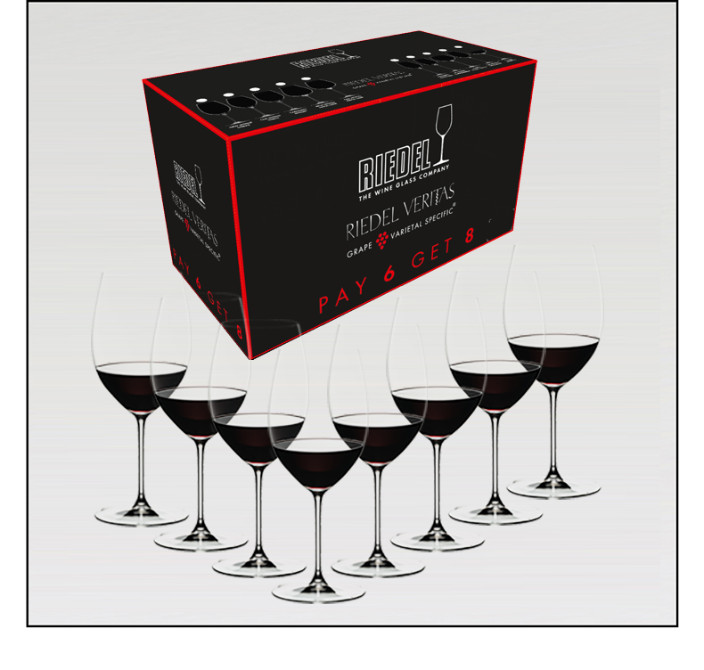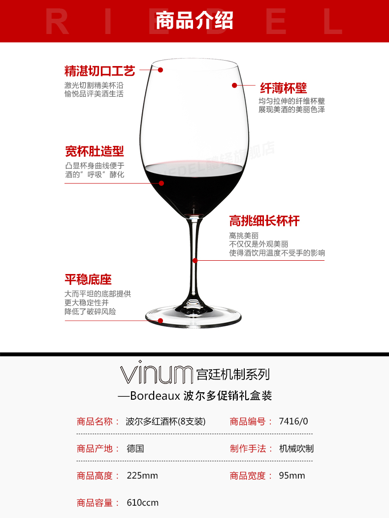 奥地利RIEDEL 波尔多型红酒杯8支礼盒装 无铅水晶德国进口