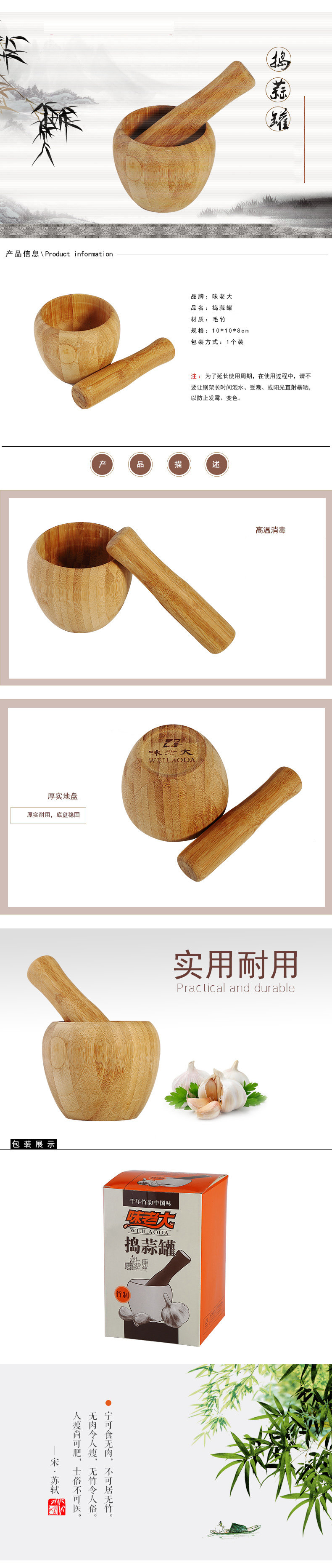 以下是味老大竹制捣蒜球200度高温炭化家用厨房压蒜器捣蒜罐蒜泥器的详细说明,厂家介绍,求购联系信息,最终解释权归浙江味老大工贸有限公司所有