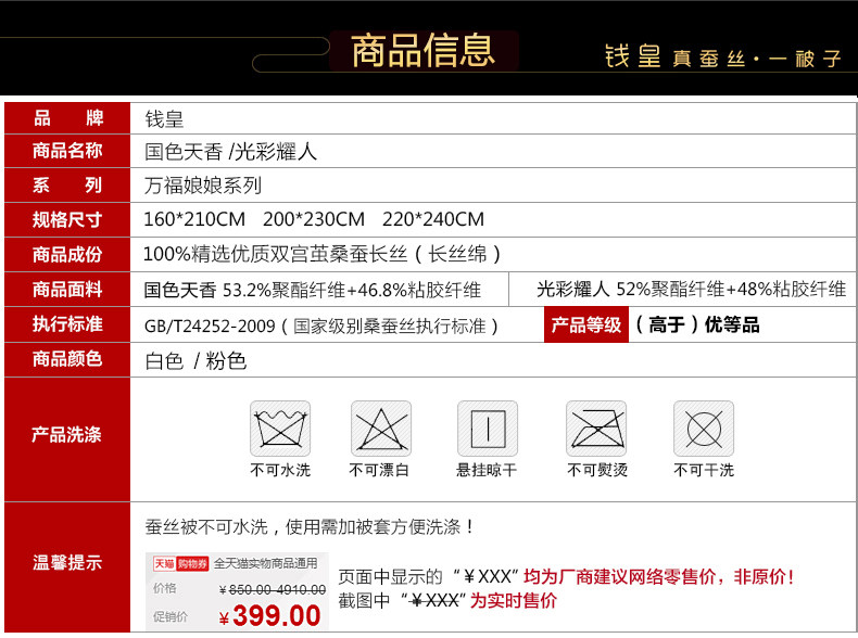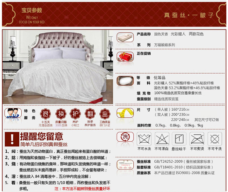 钱皇100%桑蚕丝被 子母被春秋加厚保暖冬被 被芯空调被