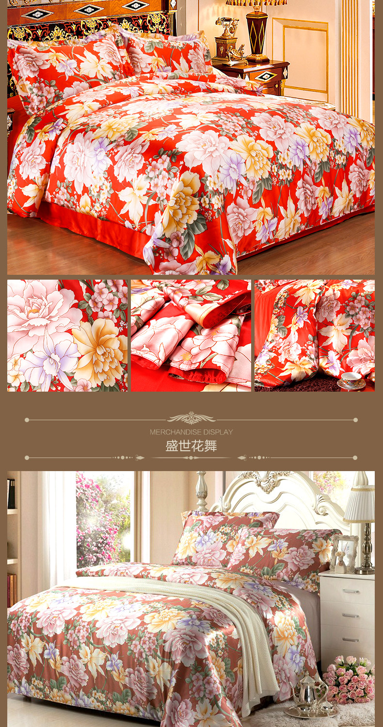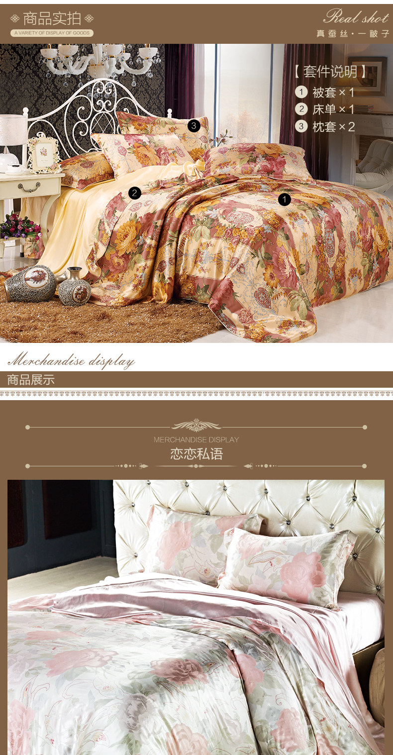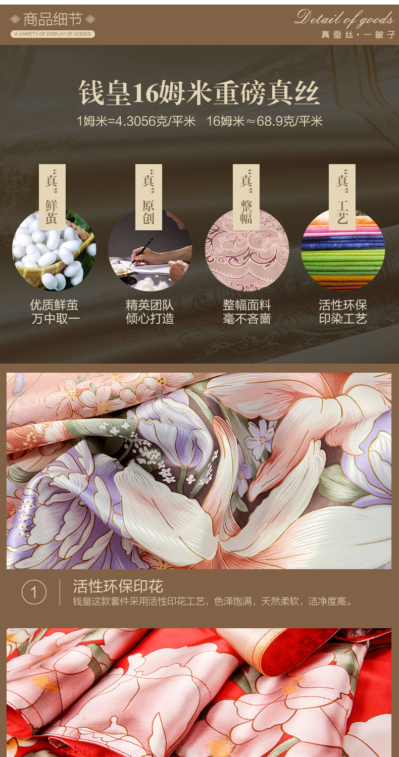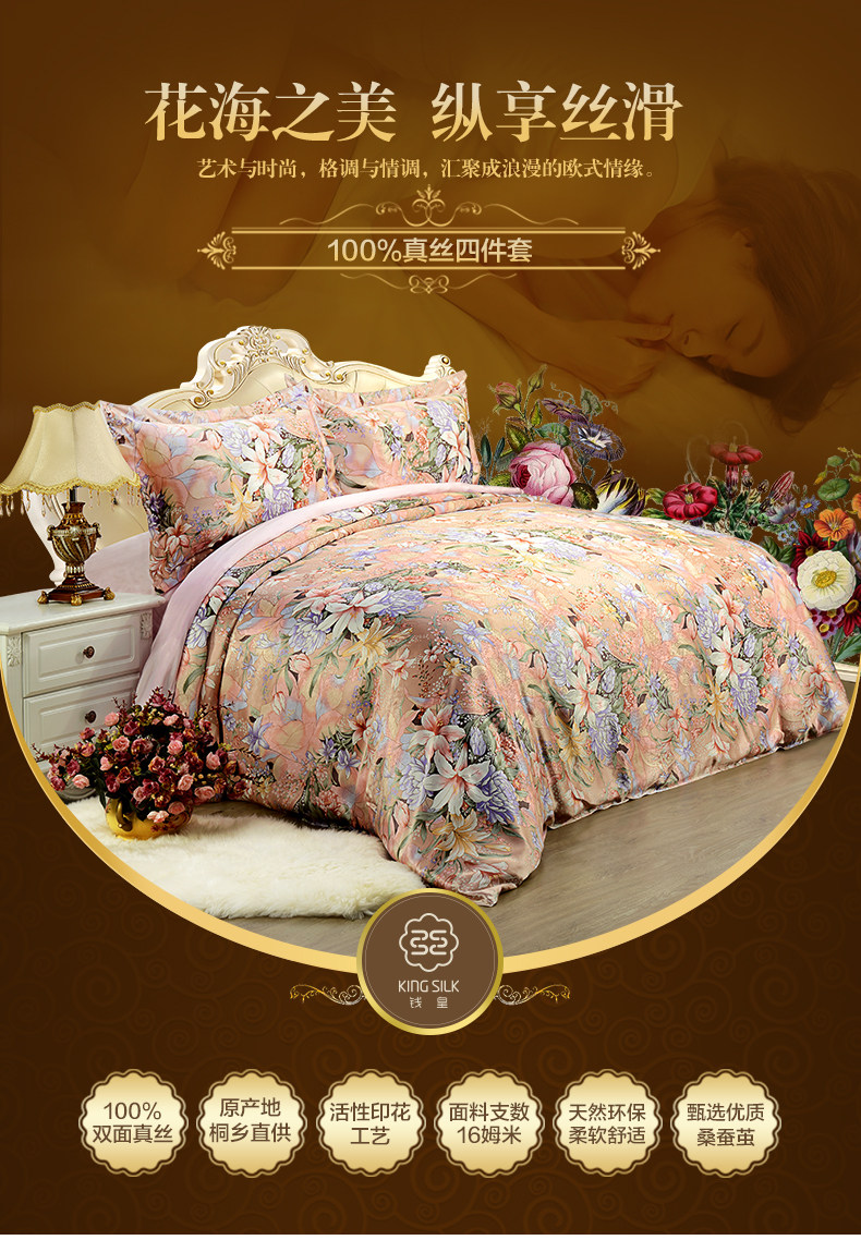 钱皇100%双面真丝四件套 丝绸婚庆印花套件 真丝床上用品床单枕套