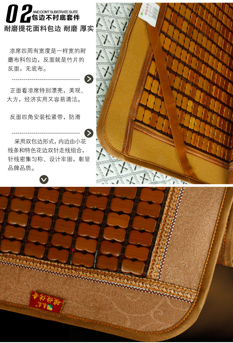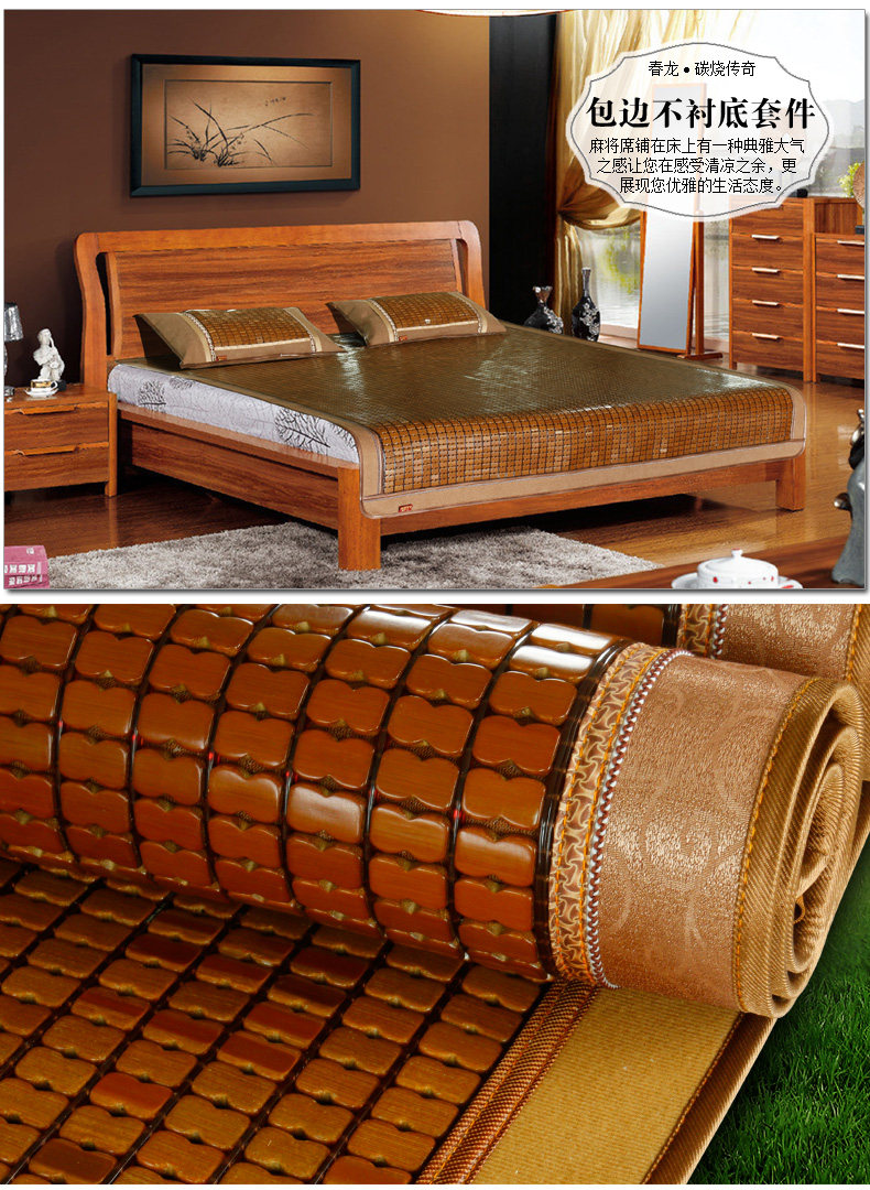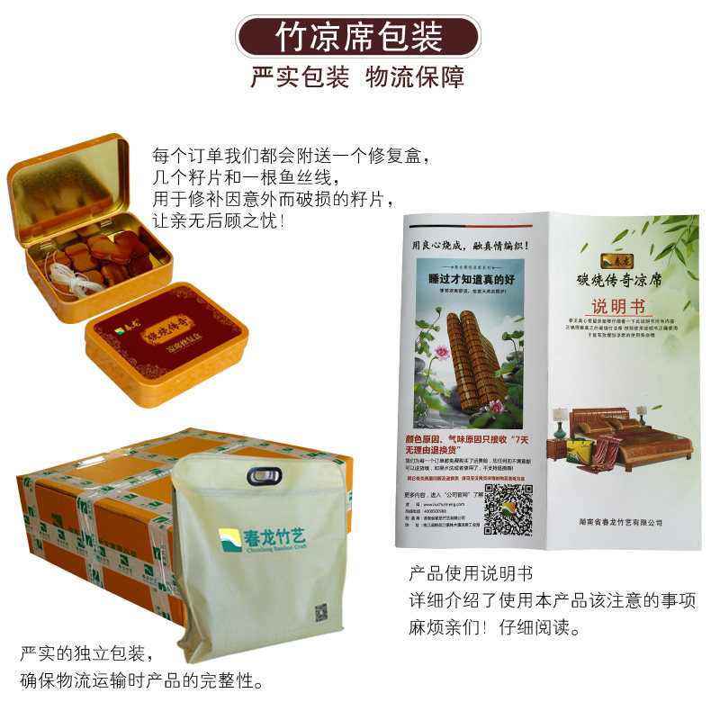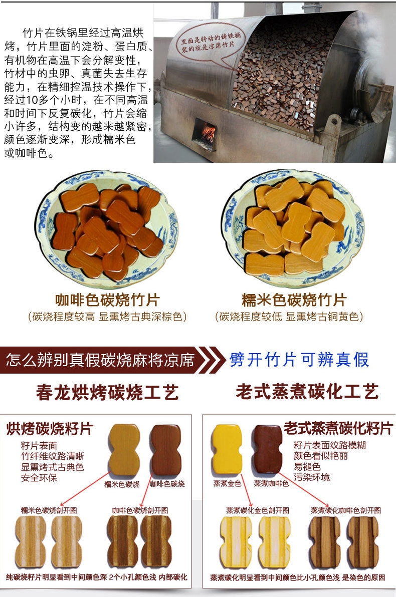 关于颜色:碳烧凉席不同于传统工艺蒸煮染色剂熬制出来的凉席,席面颜色为熏烤古典色,有古典存旧感,竹片间有可能有色差,另外不同件、不同批次生产的竹片也有可能有色差,即不同件凉席颜色有可能有深浅。