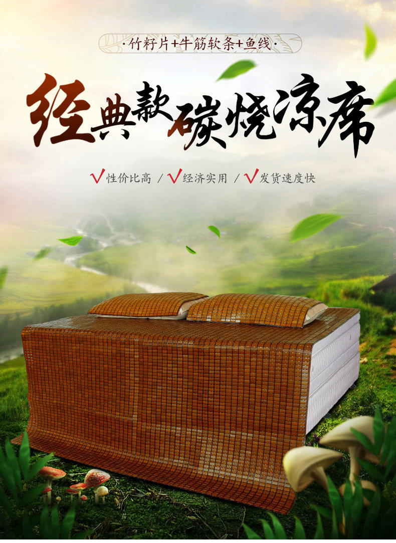 关于气味:本款凉席有竹子碳烧自然焦烤味道!就像茶叶有茶叶气味一样,竹子本来是有机生物,不同于其它产品,凉席有竹子碳烧后形成的自然碳烧焦烤气味,非有害化学味道,大家可以放心使用。