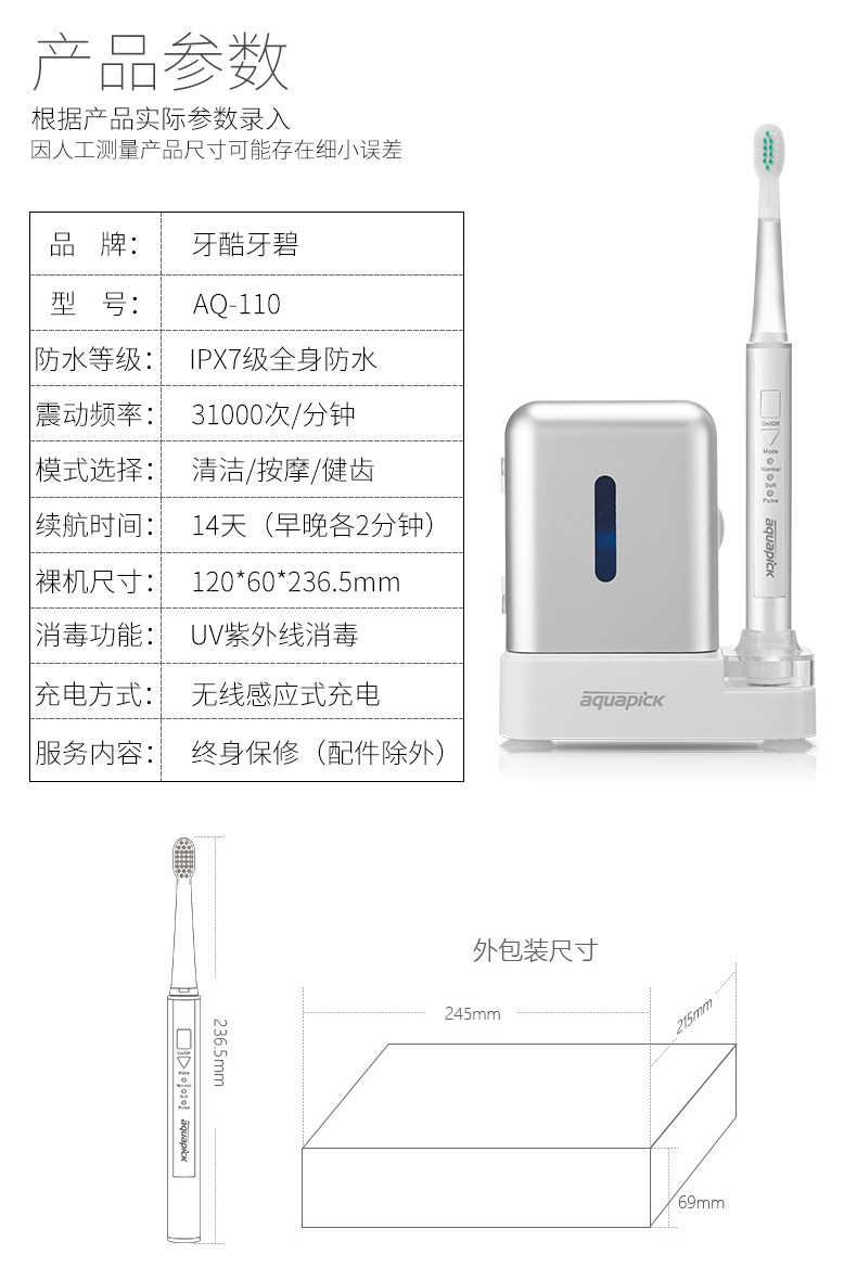 韩国aquapick/牙酷牙碧AQ110电动牙刷家用智能充电式防水软毛牙刷
