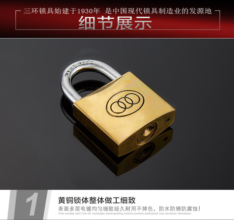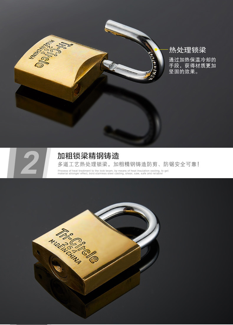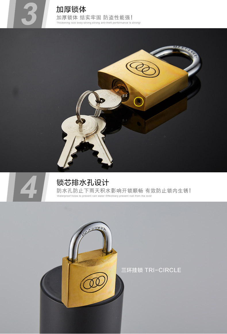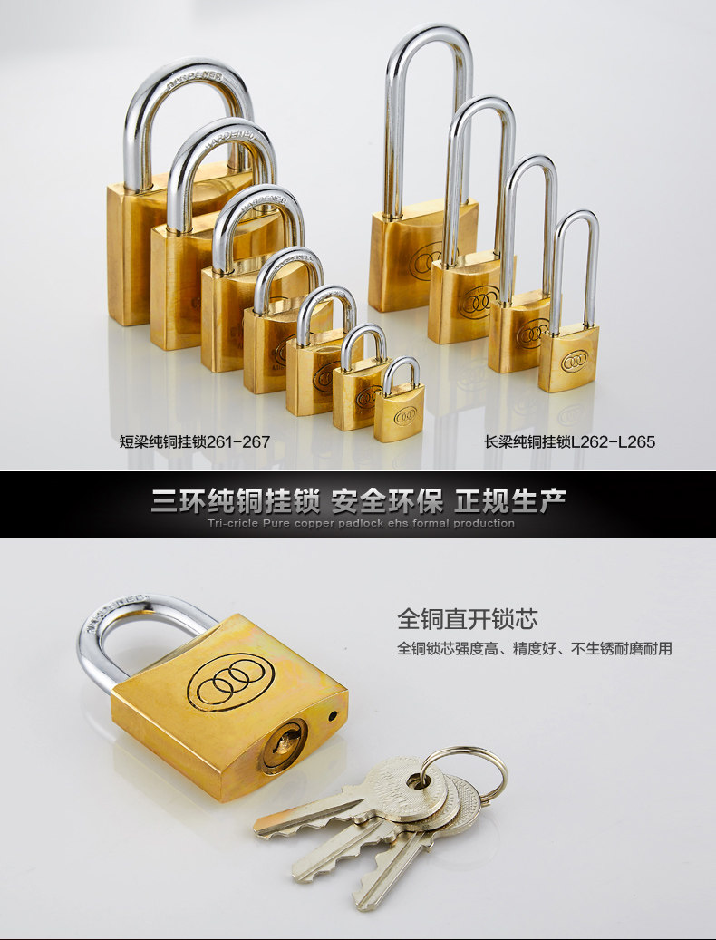 三环长梁黄铜挂锁仓库房门厚版通开锁直开防锈纯铜锁头L262-L265
