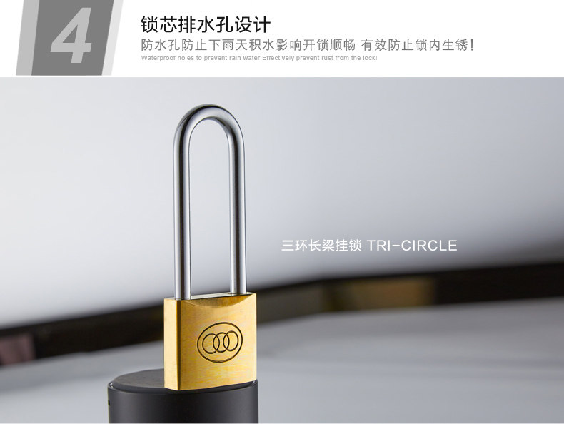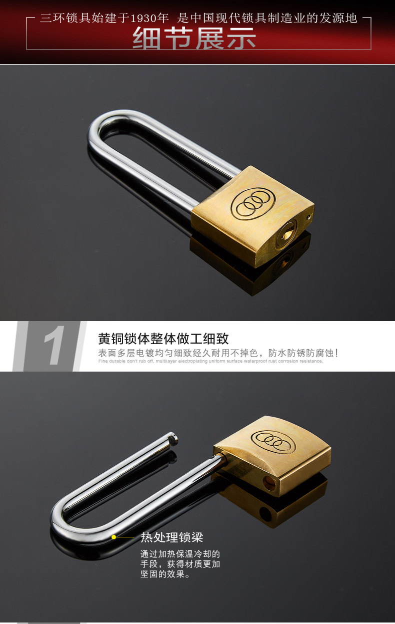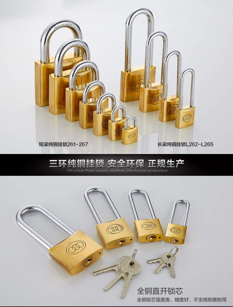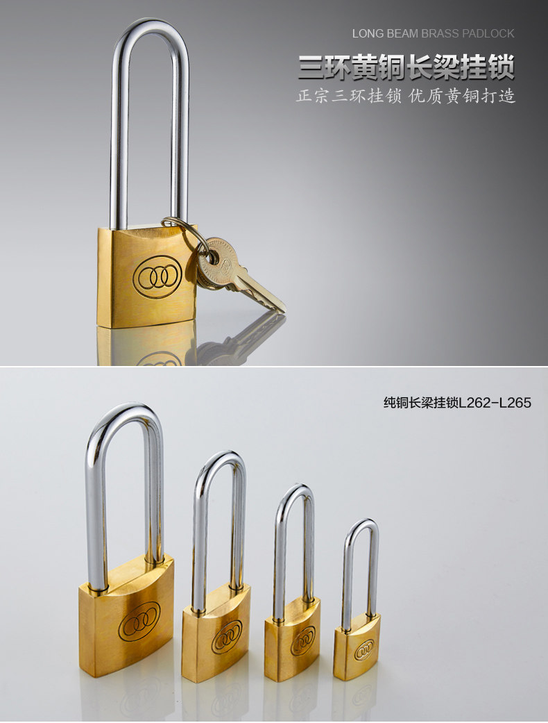 三环长梁黄铜挂锁仓库房门厚版通开锁直开防锈纯铜锁头L262-L265