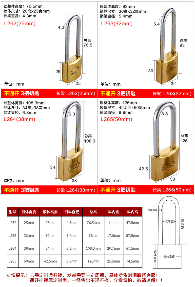 友情提示:若需定制通开锁,发货需要一定周期,具体发货时间联系客服!通开挂锁属定制类,一经售出不退不换,介意慎拍,敬请谅解!!!