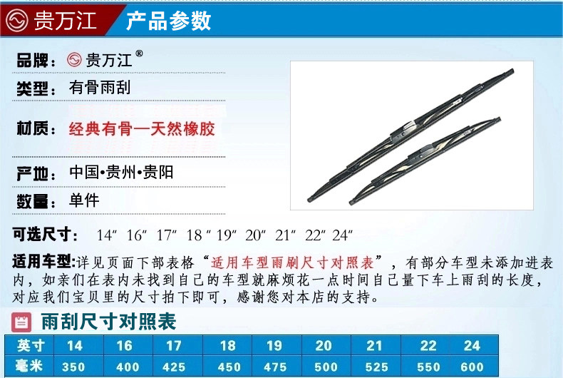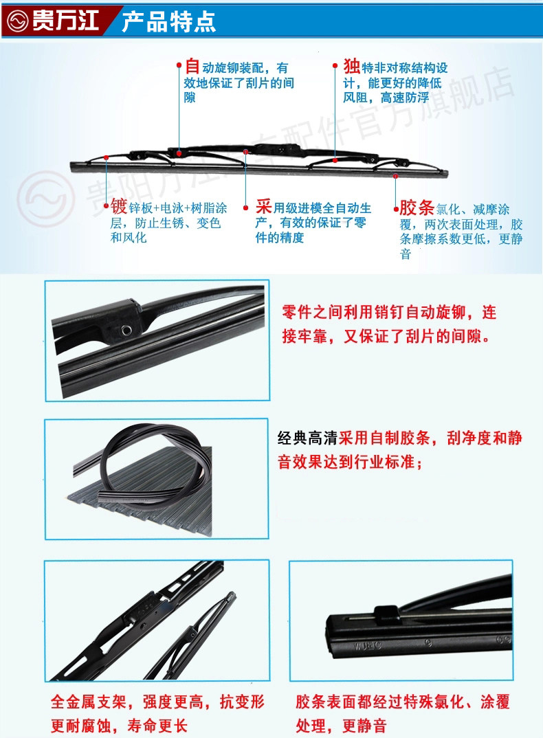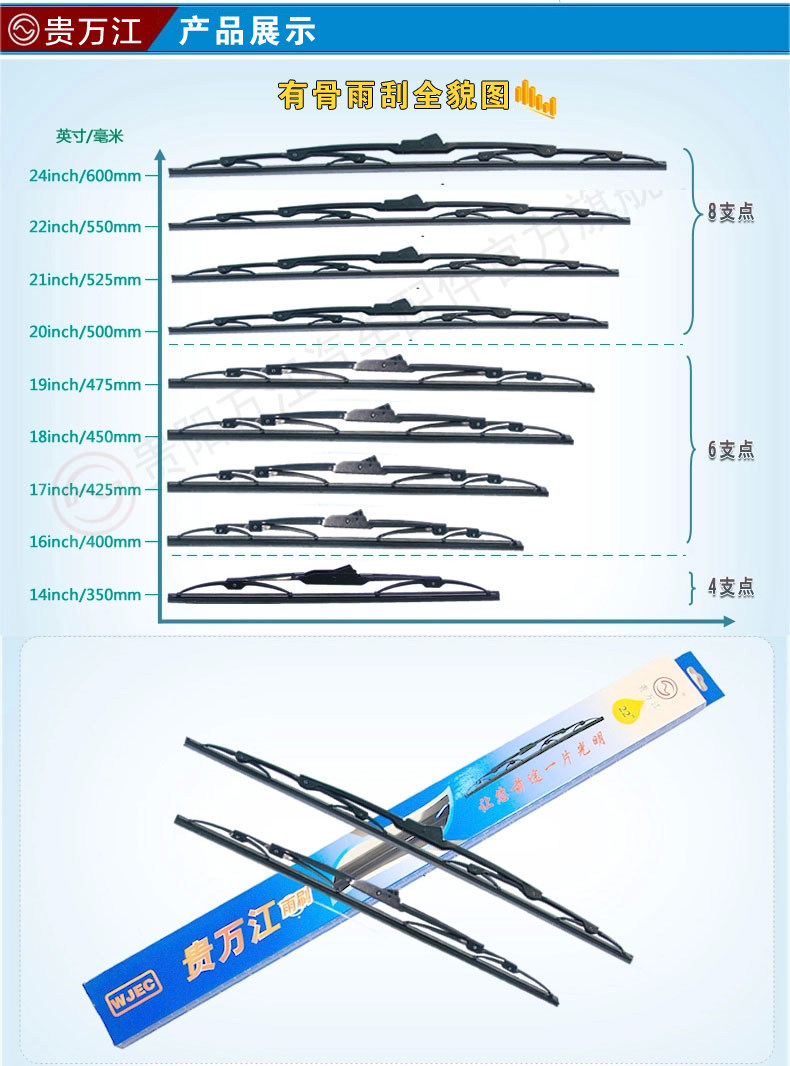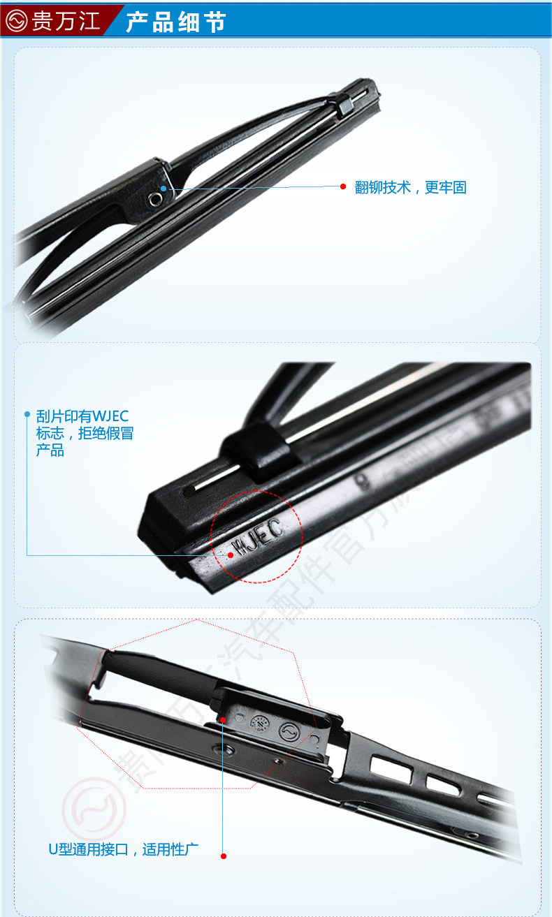 以下是贵万江 U型有骨雨刷器雨刮器U型有骨雨刮片雨刷片适用95%以上车型的详细说明,厂家介绍,求购联系信息,最终解释权归贵阳万江航空机电有限公司所有
