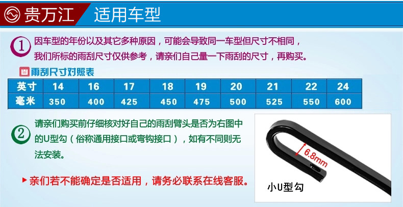 本款有骨雨刮为小U接口,适用于市场上95%以上车型