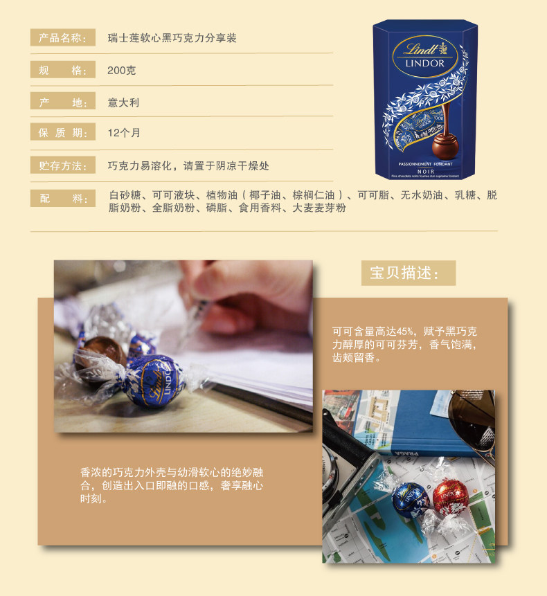 Lindt瑞士莲软心巧克力精选特浓黑牛奶白巧分享装200克巧克力