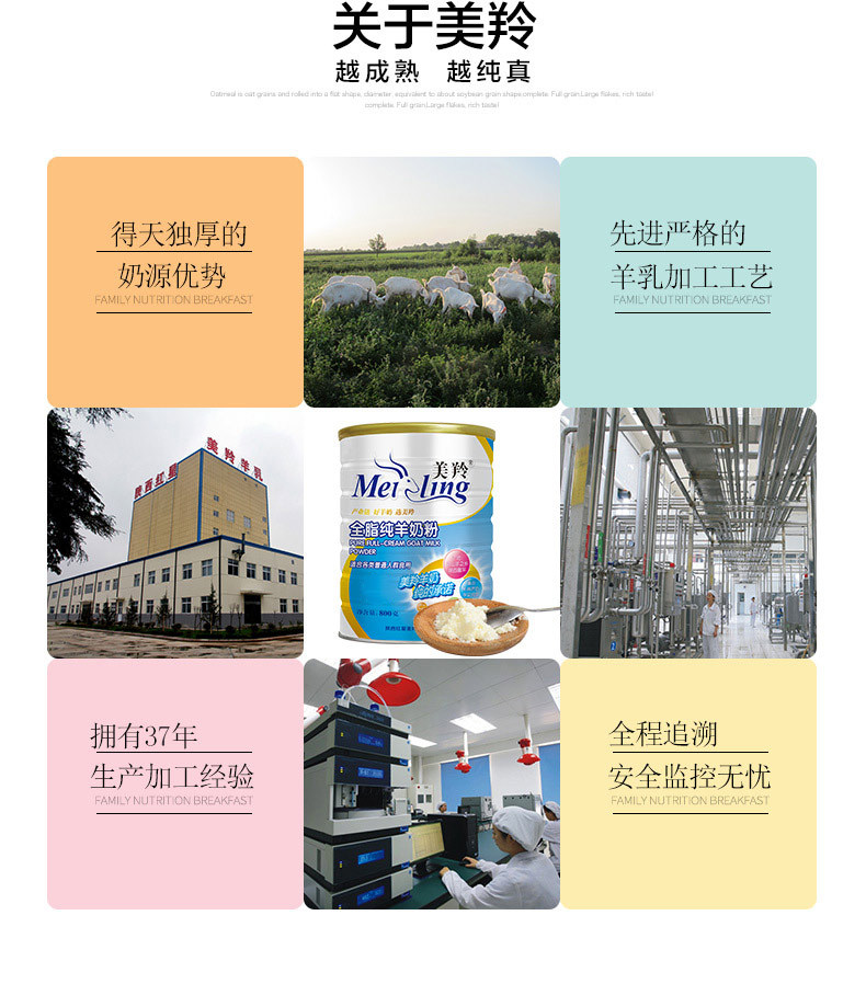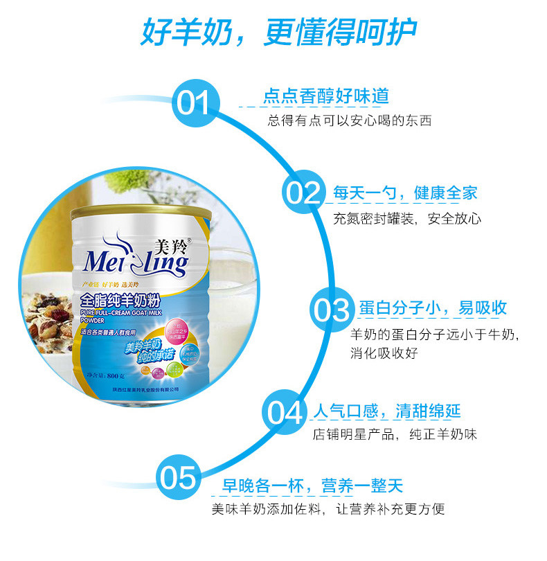 以下是【美羚旗舰店】美羚全脂纯无蔗糖成人羊奶粉800g的详细说明,厂家介绍,求购联系信息,最终解释权归陕西红星美羚乳业股份有限公司所有