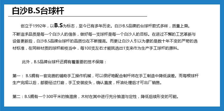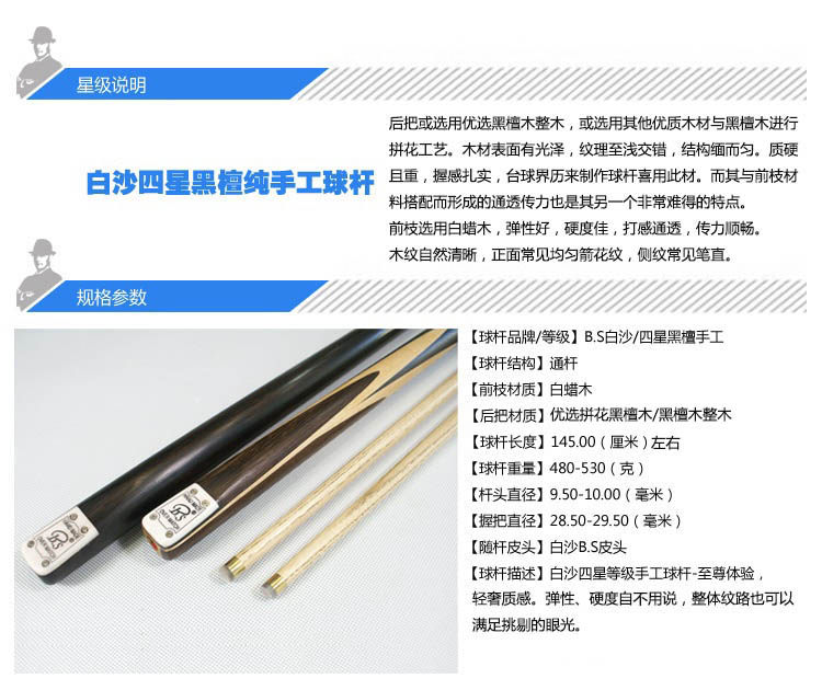 以下是正品bs白沙四星手工通杆白蜡木台球杆 桌球杆斯诺克黑8球杆优选级的详细说明,厂家介绍,求购联系信息,最终解释权归上海诺坤商贸有限公司所有