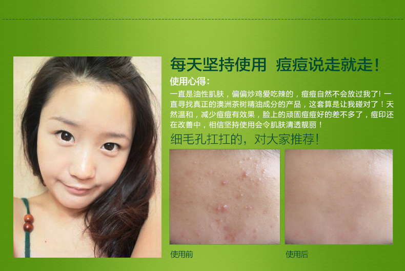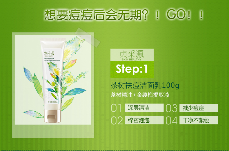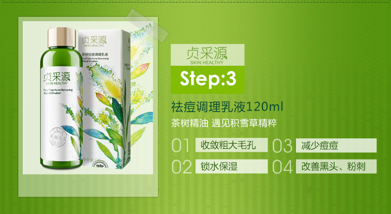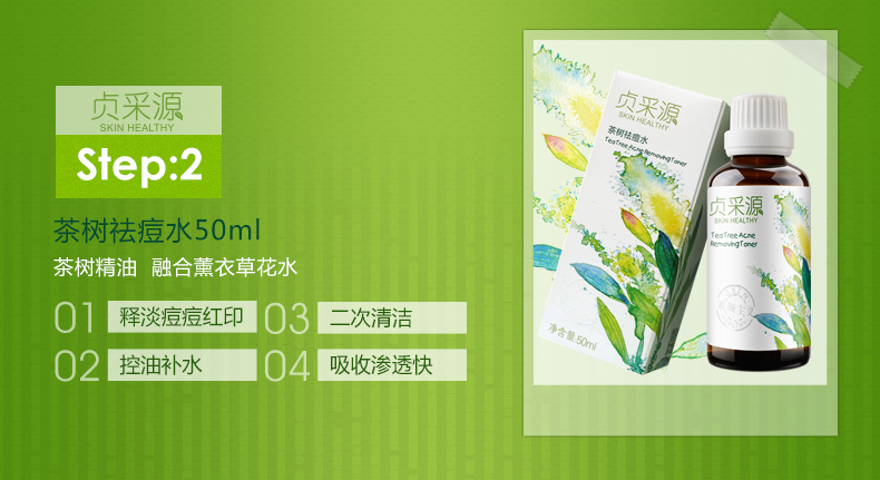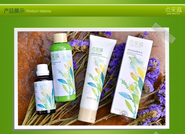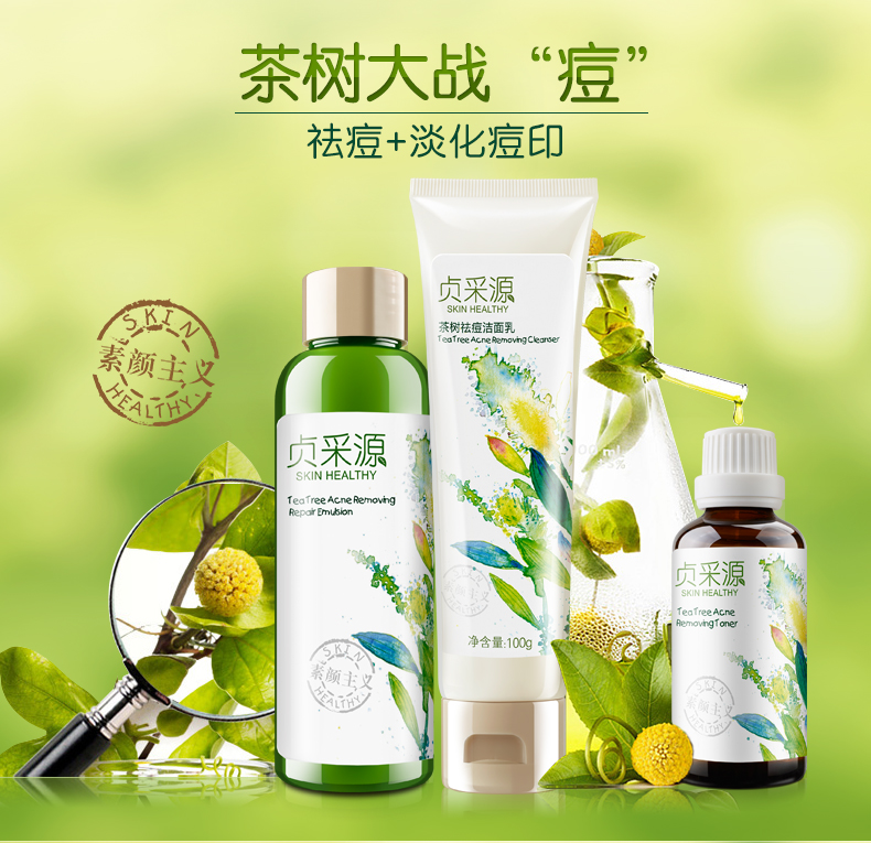 茶树精粹层层渗透肌肤,深层净化肌肤污垢、死皮、黑头,畅通毛孔,调节水油平衡,减少痘痘生成,让肌肤绽放明净神采,跟随“叶系”精灵开启森林护肤之旅。套装包括:茶树祛痘洁面乳100g+茶树祛痘水50g+茶树祛痘调理乳液120ml