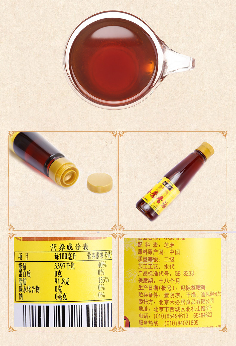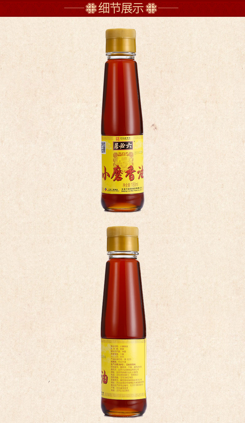 以下是六必居旗舰店 香油180ml 小磨香油的详细说明,厂家介绍,求购联系信息,最终解释权归北京六必居食品有限公司所有